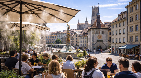 Fribourg combine un centre historique dense, des quartiers universitaires animés et des zones résidentielles en relief. Cette configuration crée des contrastes d’exposition au soleil très marqués durant l’été. Les surfaces minérales accumulent la chaleur et la restituent en continu. Certains espaces extérieurs deviennent alors difficilement exploitables aux heures les plus chaudes.